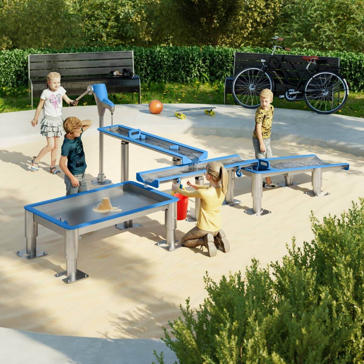 Aqua Mud Factory - modulárny vodný systém pre detské ihriská, ktorý kombinuje pumpu, kanály a vodné prvky do kreatívnych zostáv.